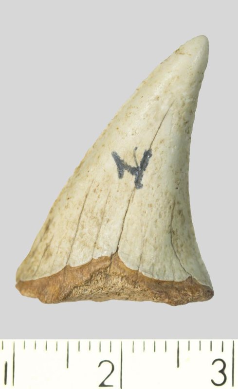 Зуб (фрагмент). Акула. Otodus minor mediavus (Leriche, 1942). Классификация: Хордовые Chordata, Позвоночные Vertebrata, Хрящевые рыбы Chondrichthyes, Пластиножаберные Elasmobranchii