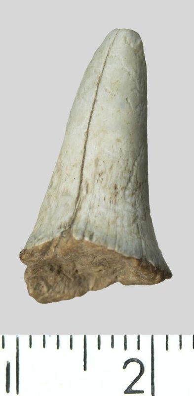 Зуб (фрагмент). Акула. Otodus minor mediavus (Leriche, 1942). Классификация: Хордовые Chordata, Позвоночные Vertebrata, Хрящевые рыбы Chondrichthyes, Пластиножаберные Elasmobranchii