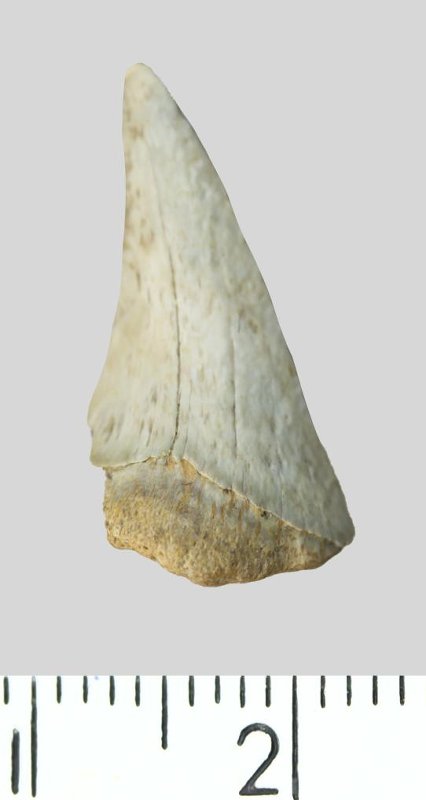 Зуб (фрагмент). Акула. Otodus minor mediavus (Leriche, 1942). Классификация: Хордовые Chordata, Позвоночные Vertebrata, Хрящевые рыбы Chondrichthyes, Пластиножаберные Elasmobranchii