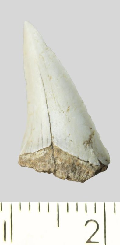 Зуб (фрагмент). Акула. Otodus minor mediavus (Leriche, 1942). Классификация: Хордовые Chordata, Позвоночные Vertebrata, Хрящевые рыбы Chondrichthyes, Пластиножаберные Elasmobranchii