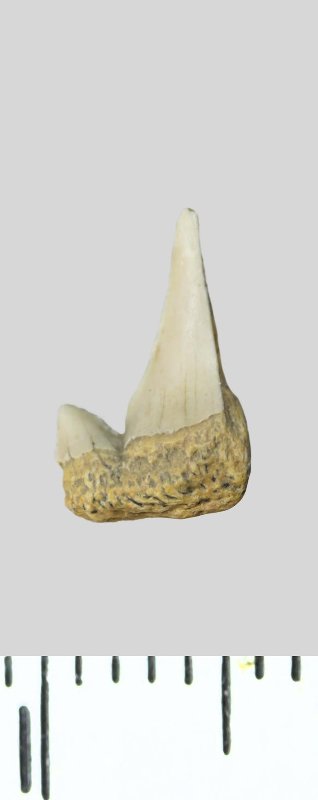 Зуб (фрагмент). Акула. Otodus minor mediavus (Leriche, 1942). Классификация: Хордовые Chordata, Позвоночные Vertebrata, Хрящевые рыбы Chondrichthyes, Пластиножаберные Elasmobranchii