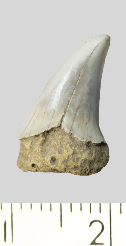 Зуб (фрагмент). Акула. Otodus minor mediavus (Leriche, 1942). Классификация: Хордовые Chordata, Позвоночные Vertebrata, Хрящевые рыбы Chondrichthyes, Пластиножаберные Elasmobranchii