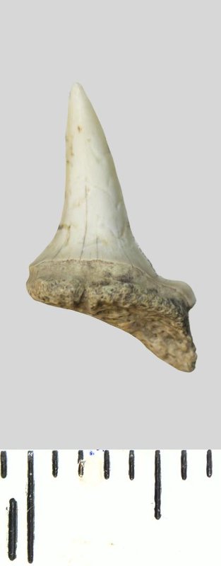 Зуб. Акула. Striatolamia striata (Winkler, 1874). Классификация: Хордовые Chordata, Позвоночные Vertebrata, Хрящевые рыбы Chondrichthyes, Пластиножаберные Elasmobranchii