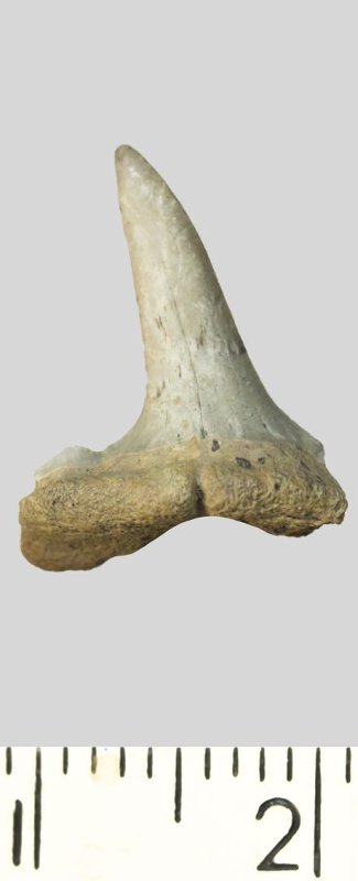 Зуб. Акула. Striatolamia striata (Winkler, 1874). Классификация: Хордовые Chordata, Позвоночные Vertebrata, Хрящевые рыбы Chondrichthyes, Пластиножаберные Elasmobranchii