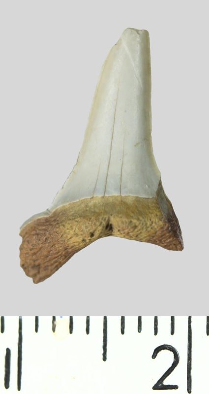Зуб. Акула. Striatolamia striata (Winkler, 1874). Классификация: Хордовые Chordata, Позвоночные Vertebrata, Хрящевые рыбы Chondrichthyes, Пластиножаберные Elasmobranchii