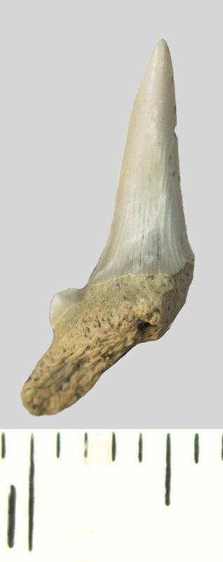 Зуб. Акула. Striatolamia striata (Winkler, 1874). Классификация: Хордовые Chordata, Позвоночные Vertebrata, Хрящевые рыбы Chondrichthyes, Пластиножаберные Elasmobranchii