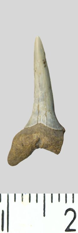 Зуб. Акула. Striatolamia striata (Winkler, 1874). Классификация: Хордовые Chordata, Позвоночные Vertebrata, Хрящевые рыбы Chondrichthyes, Пластиножаберные Elasmobranchii