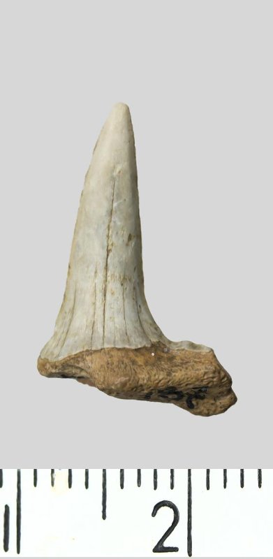 Зуб. Акула. Striatolamia striata (Winkler, 1874). Классификация: Хордовые Chordata, Позвоночные Vertebrata, Хрящевые рыбы Chondrichthyes, Пластиножаберные Elasmobranchii