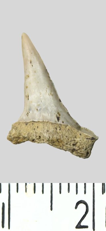 Зуб. Акула. Striatolamia striata (Winkler, 1874). Классификация: Хордовые Chordata, Позвоночные Vertebrata, Хрящевые рыбы Chondrichthyes, Пластиножаберные Elasmobranchii