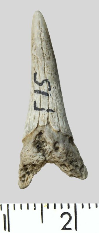 Зуб. Акула. Palaeohypotodus rutoti (Winkler, 1874). Классификация: Хордовые Chordata, Позвоночные Vertebrata, Хрящевые рыбы Chondrichthyes, Пластиножаберные Elasmobranchii