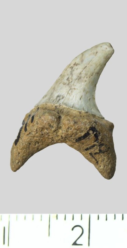 Зуб. Акула. Palaeohypotodus rutoti (Winkler, 1874). Классификация: Хордовые Chordata, Позвоночные Vertebrata, Хрящевые рыбы Chondrichthyes, Пластиножаберные Elasmobranchii