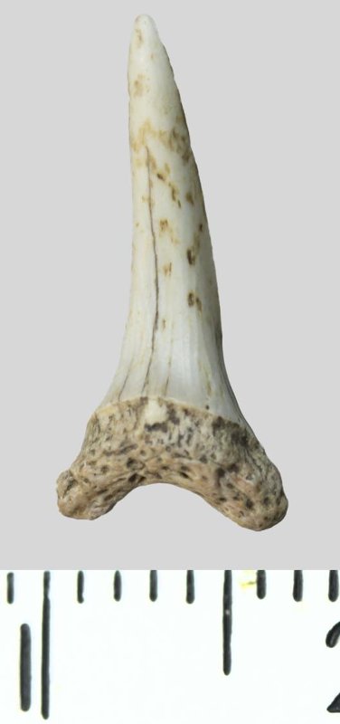 Зуб. Акула. Odontaspis whitei Arambourg, 1952. Классификация: Хордовые Chordata, Позвоночные Vertebrata, Хрящевые рыбы Chondrichthyes, Пластиножаберные Elasmobranchii