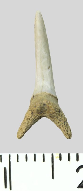 Зуб. Акула. Odontaspis whitei Arambourg, 1952. Классификация: Хордовые Chordata, Позвоночные Vertebrata, Хрящевые рыбы Chondrichthyes, Пластиножаберные Elasmobranchii