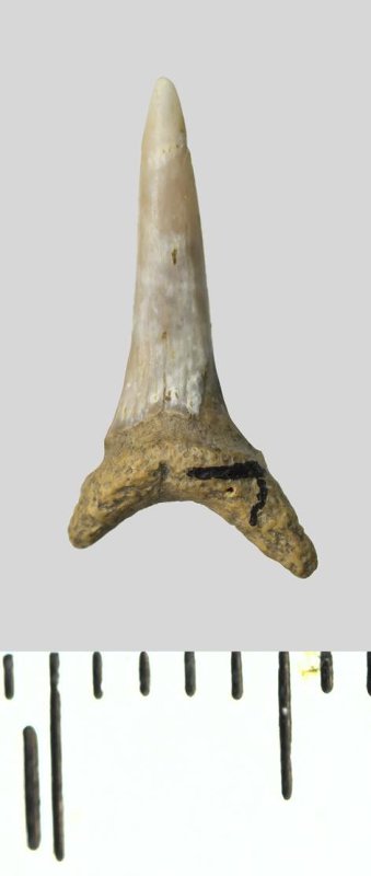 Зуб. Акула. Odontaspis whitei Arambourg, 1952. Классификация: Хордовые Chordata, Позвоночные Vertebrata, Хрящевые рыбы Chondrichthyes, Пластиножаберные Elasmobranchii