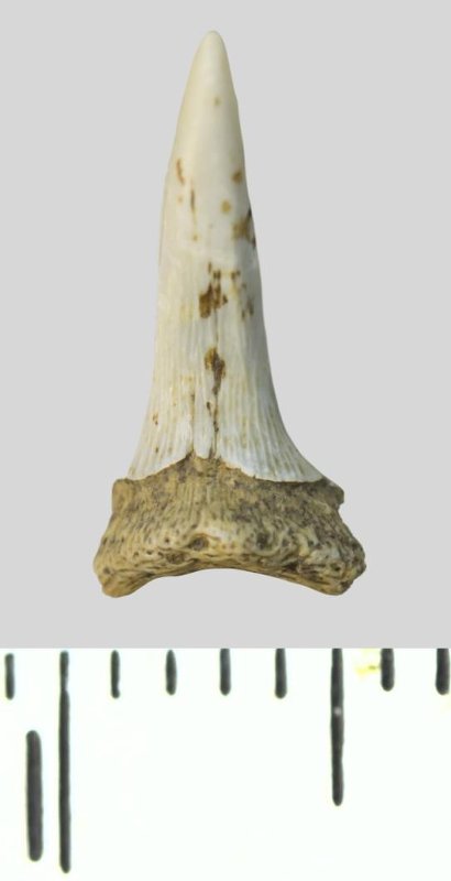 Зуб. Акула. Odontaspis whitei Arambourg, 1952. Классификация: Хордовые Chordata, Позвоночные Vertebrata, Хрящевые рыбы Chondrichthyes, Пластиножаберные Elasmobranchii