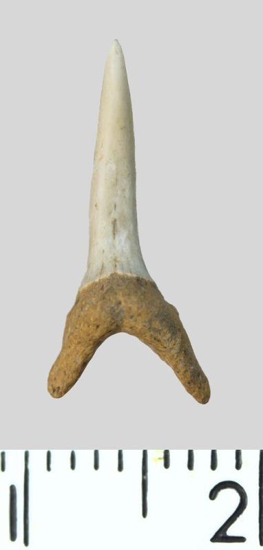 Зуб. Акула. Odontaspis whitei Arambourg, 1952. Классификация: Хордовые Chordata, Позвоночные Vertebrata, Хрящевые рыбы Chondrichthyes, Пластиножаберные Elasmobranchii