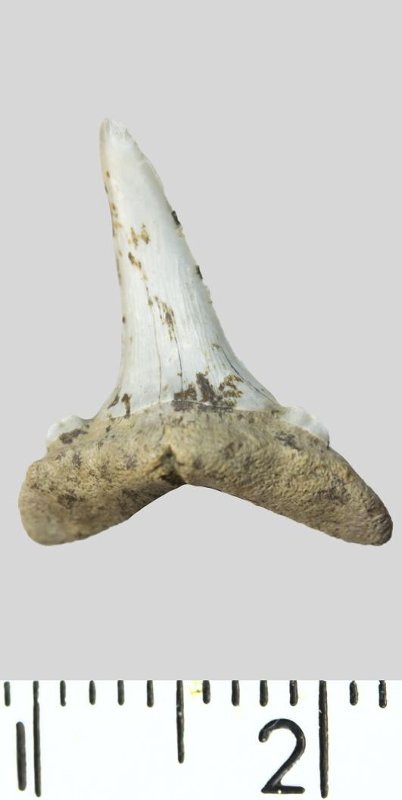 Зуб. Акула. Striatolamia striata (Winkler, 1874). Классификация: Хордовые Chordata, Позвоночные Vertebrata, Хрящевые рыбы Chondrichthyes, Пластиножаберные Elasmobranchii