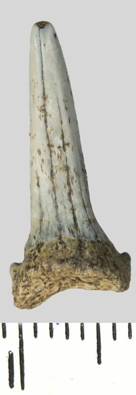 Зуб. Акула. Striatolamia striata (Winkler, 1874). Классификация: Хордовые Chordata, Позвоночные Vertebrata, Хрящевые рыбы Chondrichthyes, Пластиножаберные Elasmobranchii