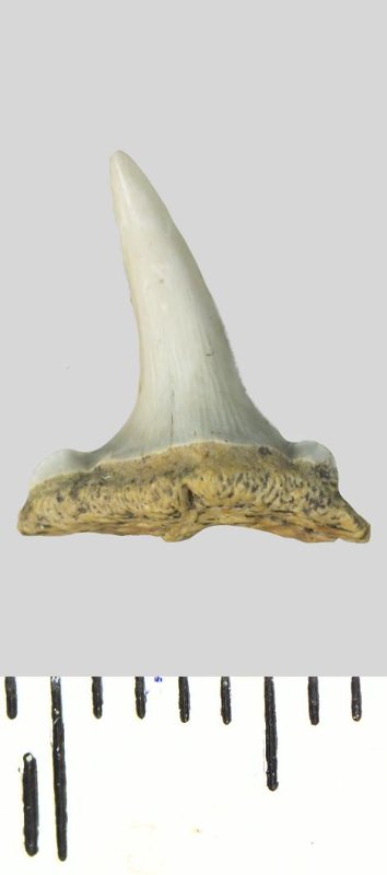 Зуб. Акула. Striatolamia striata (Winkler, 1874). Классификация: Хордовые Chordata, Позвоночные Vertebrata, Хрящевые рыбы Chondrichthyes, Пластиножаберные Elasmobranchii