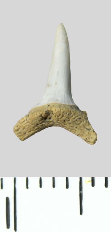 Зуб. Акула. Odontaspis whitei Arambourg, 1952. Классификация: Хордовые Chordata, Позвоночные Vertebrata, Хрящевые рыбы Chondrichthyes, Пластиножаберные Elasmobranchii