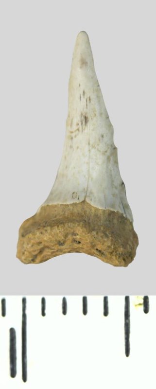 Зуб. Акула. Odontaspis whitei Arambourg, 1952. Классификация: Хордовые Chordata, Позвоночные Vertebrata, Хрящевые рыбы Chondrichthyes, Пластиножаберные Elasmobranchii