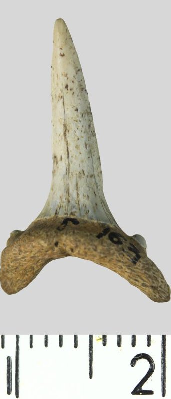 Зуб. Акула. Striatolamia striata (Winkler, 1874). Классификация: Хордовые Chordata, Позвоночные Vertebrata, Хрящевые рыбы Chondrichthyes, Пластиножаберные Elasmobranchii