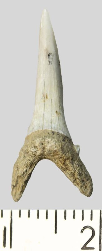 Зуб. Акула. Striatolamia striata (Winkler, 1874). Классификация: Хордовые Chordata, Позвоночные Vertebrata, Хрящевые рыбы Chondrichthyes, Пластиножаберные Elasmobranchii