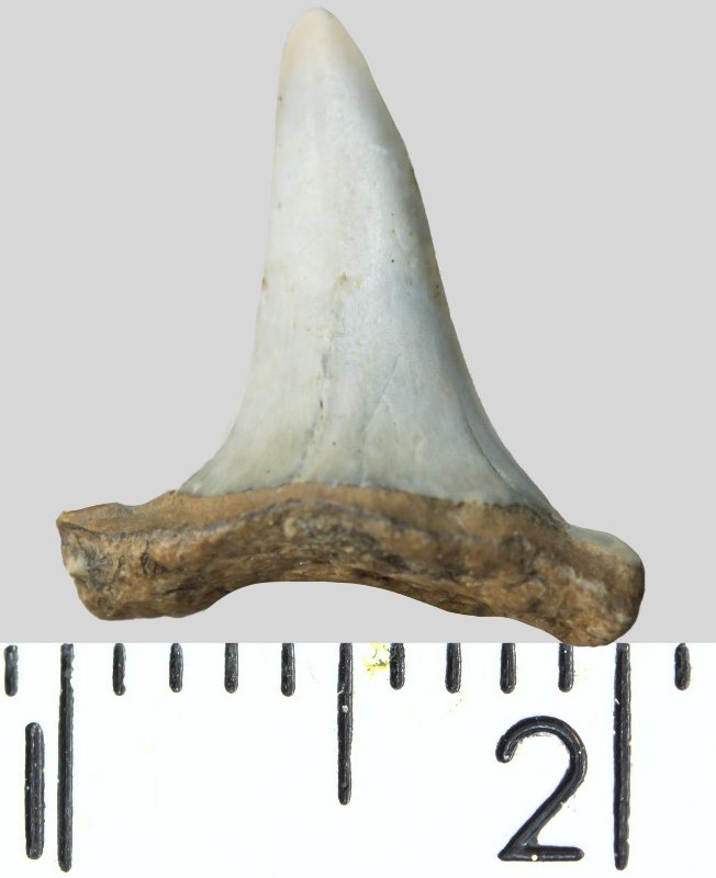 Зуб. Акула. Striatolamia striata (Winkler, 1874). Классификация: Хордовые Chordata, Позвоночные Vertebrata, Хрящевые рыбы Chondrichthyes, Пластиножаберные Elasmobranchii