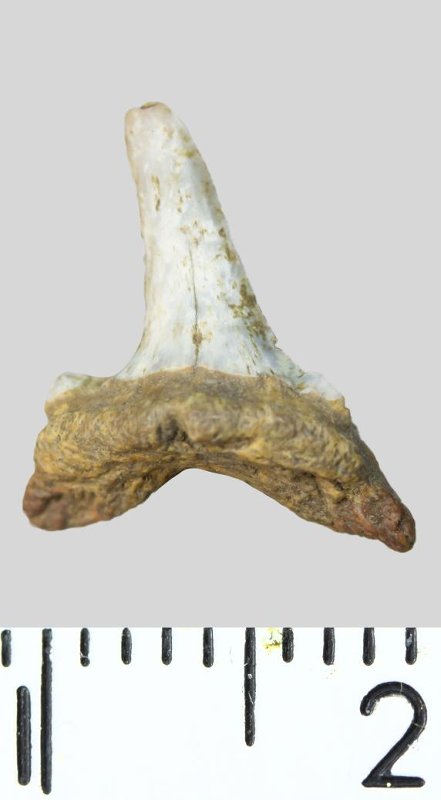 Зуб. Акула. Striatolamia striata (Winkler, 1874). Классификация: Хордовые Chordata, Позвоночные Vertebrata, Хрящевые рыбы Chondrichthyes, Пластиножаберные Elasmobranchii