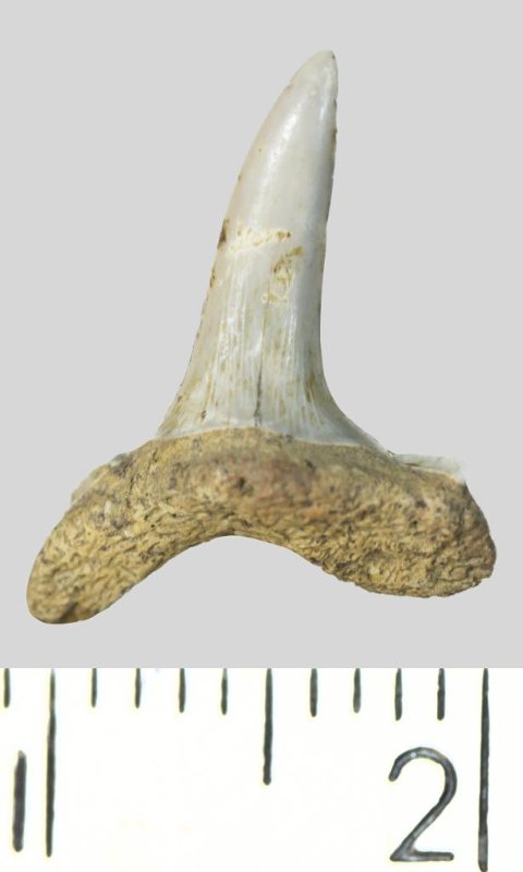 Зуб. Акула. Striatolamia striata (Winkler, 1874). Классификация: Хордовые Chordata, Позвоночные Vertebrata, Хрящевые рыбы Chondrichthyes, Пластиножаберные Elasmobranchii