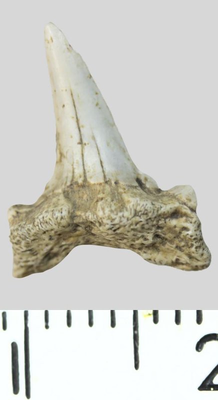 Зуб. Акула. Striatolamia striata (Winkler, 1874). Классификация: Хордовые Chordata, Позвоночные Vertebrata, Хрящевые рыбы Chondrichthyes, Пластиножаберные Elasmobranchii
