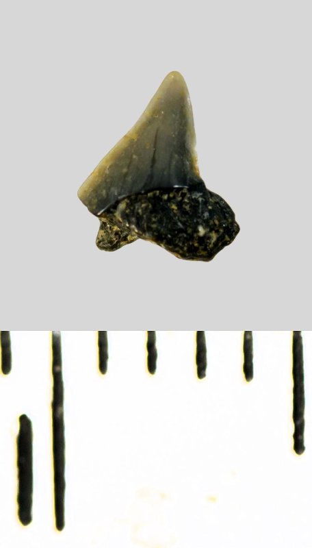 Зуб (фрагмент). Акула. Palaeoanacorax volgensis Glueckman, 1971. Классификация: Хордовые Chordata, Позвоночные Vertebrata, Хрящевые рыбы Chondrichthyes, Пластиножаберные Elasmobranchii, Акулы Selachii, Ламнообразные Lamniformes, Anacoracidae