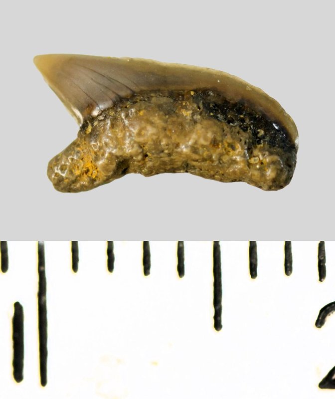 Зуб (фрагмент). Акула. Palaeoanacorax volgensis Glueckman, 1971. Классификация: Хордовые Chordata, Позвоночные Vertebrata, Хрящевые рыбы Chondrichthyes, Пластиножаберные Elasmobranchii, Акулы Selachii, Ламнообразные Lamniformes, Anacoracidae
