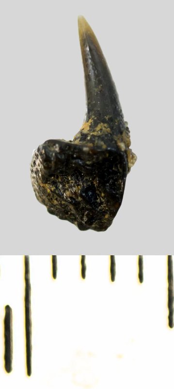 Зуб (фрагмент). Акула. Synechodus sp. Классификация: Хордовые Chordata, Позвоночные Vertebrata, Хрящевые рыбы Chondrichthyes, Пластиножаберные Elasmobranchii, Акулы Selachii, Синеходонтообразные Synechodontiformes, Palaeospinacidae