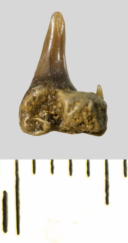 Зуб (фрагмент). Акула. Synechodus sp. Классификация: Хордовые Chordata, Позвоночные Vertebrata, Хрящевые рыбы Chondrichthyes, Пластиножаберные Elasmobranchii, Акулы Selachii, Синеходонтообразные Synechodontiformes, Palaeospinacidae