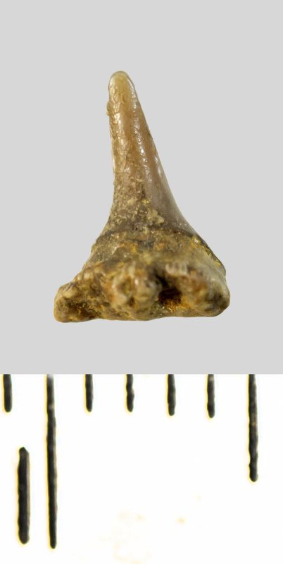 Зуб (фрагмент). Акула. Synechodus sp. Классификация: Хордовые Chordata, Позвоночные Vertebrata, Хрящевые рыбы Chondrichthyes, Пластиножаберные Elasmobranchii, Акулы Selachii, Синеходонтообразные Synechodontiformes, Palaeospinacidae