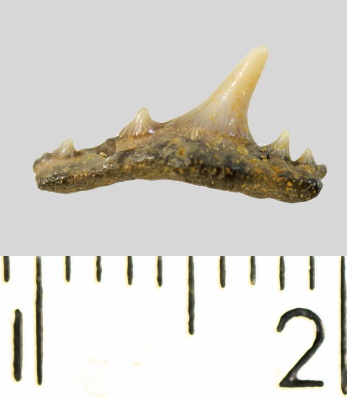 Зуб. Акула. Synechodus dubrisiensis (Mackie, 1863). Классификация: Хордовые Chordata, Позвоночные Vertebrata, Хрящевые рыбы Chondrichthyes, Пластиножаберные Elasmobranchii, Акулы Selachii, Синеходонтообразные Synechodontiformes, Palaeospinacidae