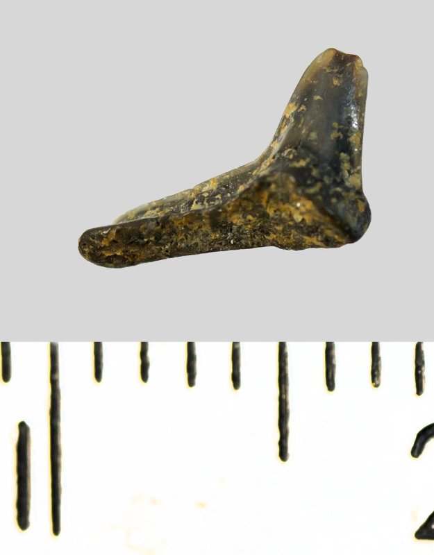 Зуб (фрагмент). Акула. Squatina sp. Классификация: Хордовые Chordata, Позвоночные Vertebrata, Хрящевые рыбы Chondrichthyes, Пластиножаберные Elasmobranchii, Акулы Selachii, Скватинообразные Squatiniformes, Морские ангелы Squatinidae