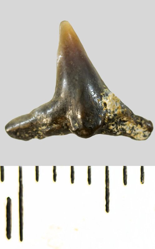 Зуб. Акула. Squatina cranei (Woodward, 1888). Классификация: Хордовые Chordata, Позвоночные Vertebrata, Хрящевые рыбы Chondrichthyes, Пластиножаберные Elasmobranchii, Акулы Selachii, Скватинообразные Squatiniformes, Морские ангелы Squatinidae