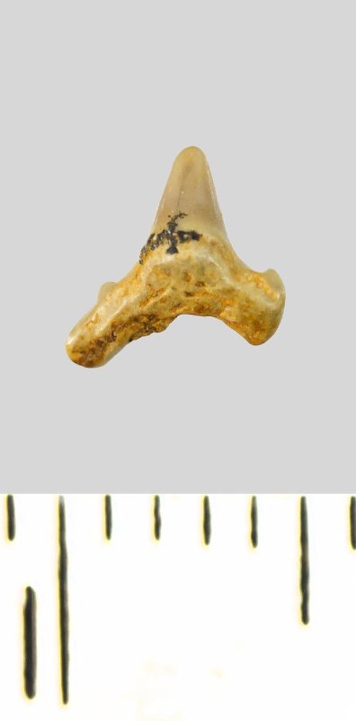 Зуб. Акула. Protoscyliorhinus cf. bettrechiensis Herman, 1977. Классификация: Хордовые Chordata, Позвоночные Vertebrata, Хрящевые рыбы Chondrichthyes, Пластиножаберные Elasmobranchii, Акулы Selachii, Серые акулы Carcharhiniformes, Кошачьи акулы Scyliorhinidae