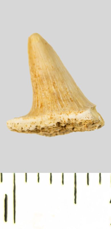 Зуб (фрагмент). Акула. Meristodon sp. Классификация: Хордовые Chordata, Позвоночные Vertebrata, Хрящевые рыбы Chondrichthyes, Пластиножаберные Elasmobranchii, Акулы Selachii, Гибодонтообразные Hybodontiformes, Гибодонты Hybodontidae