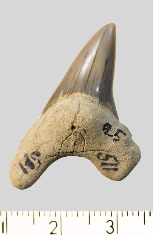 Зуб. Акула. Cretoxyrhina denticulata (Glueckman, 1957). Классификация: Хордовые Chordata, Позвоночные Vertebrata, Хрящевые рыбы Chondrichthyes, Пластиножаберные Elasmobranchii, Акулы Selachii, Ламнообразные Lamniformes, Cretoxyrhinidae