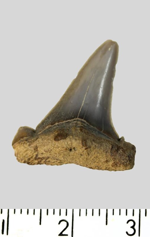 Зуб (фрагмент). Акула. Cretoxyrhina denticulata (Glueckman, 1957). Классификация: Хордовые Chordata, Позвоночные Vertebrata, Хрящевые рыбы Chondrichthyes, Пластиножаберные Elasmobranchii, Акулы Selachii, Ламнообразные Lamniformes, Cretoxyrhinidae