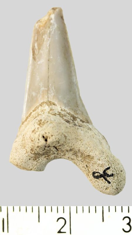 Зуб. Акула. Cretoxyrhina denticulata (Glueckman, 1957). Классификация: Хордовые Chordata, Позвоночные Vertebrata, Хрящевые рыбы Chondrichthyes, Пластиножаберные Elasmobranchii, Акулы Selachii, Ламнообразные Lamniformes, Cretoxyrhinidae