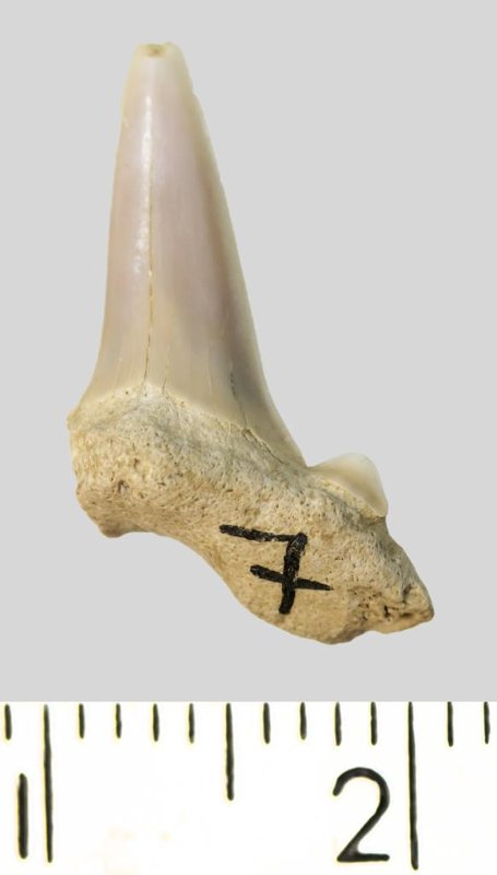 Зуб. Акула. Cretolamna cf. catoxodon Siverson, 2014. Классификация: Хордовые Chordata, Позвоночные Vertebrata, Хрящевые рыбы Chondrichthyes, Пластиножаберные Elasmobranchii, Акулы Selachii, Ламнообразные Lamniformes, Cretoxyrhinidae