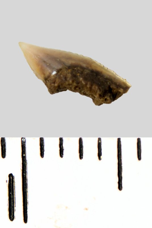 Зуб (фрагмент). Акула. Palaeoanacorax sp. Классификация: Хордовые Chordata, Позвоночные Vertebrata, Хрящевые рыбы Chondrichthyes, Пластиножаберные Elasmobranchii, Акулы Selachii, Ламнообразные Lamniformes, Anacoracidae