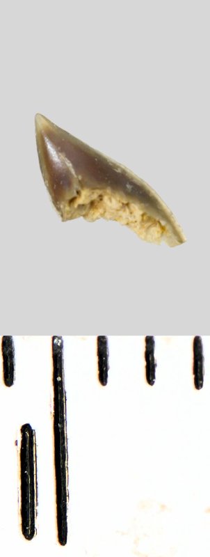 Зуб (фрагмент). Акула. Palaeoanacorax sp. Классификация: Хордовые Chordata, Позвоночные Vertebrata, Хрящевые рыбы Chondrichthyes, Пластиножаберные Elasmobranchii, Акулы Selachii, Ламнообразные Lamniformes, Anacoracidae