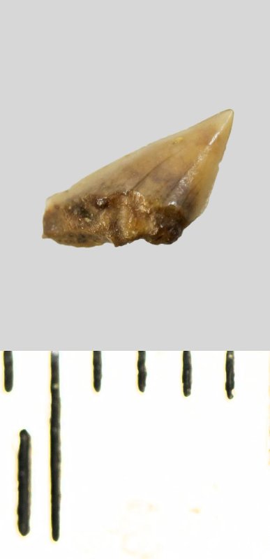 Зуб (фрагмент). Акула. Palaeoanacorax sp. Классификация: Хордовые Chordata, Позвоночные Vertebrata, Хрящевые рыбы Chondrichthyes, Пластиножаберные Elasmobranchii, Акулы Selachii, Ламнообразные Lamniformes, Anacoracidae