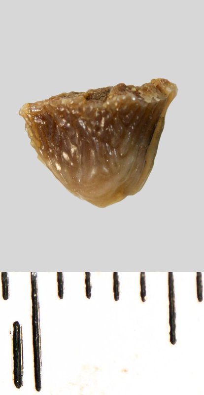 Зуб (фрагмент). Акула. Ptychodus mammillaris Agassiz, 1838. Классификация: Хордовые Chordata, Позвоночные Vertebrata, Хрящевые рыбы Chondrichthyes, Пластиножаберные Elasmobranchii, Акулы Selachii, Гибодонтообразные Hybodontiformes, Птиходонты Ptychodontidae