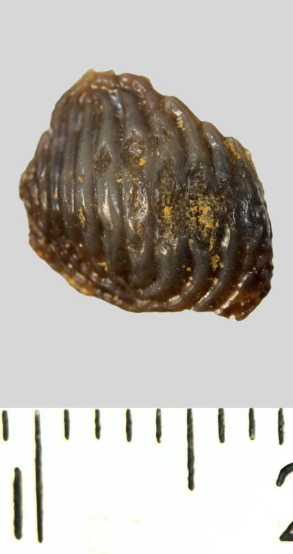 Зуб (фрагмент). Акула. Ptychodus mammillaris Agassiz, 1838. Классификация: Хордовые Chordata, Позвоночные Vertebrata, Хрящевые рыбы Chondrichthyes, Пластиножаберные Elasmobranchii, Акулы Selachii, Гибодонтообразные Hybodontiformes, Птиходонты Ptychodontidae